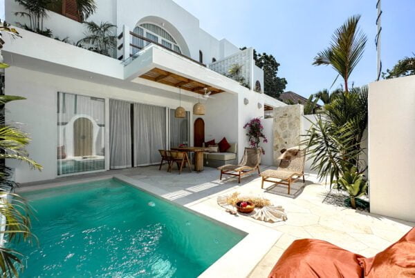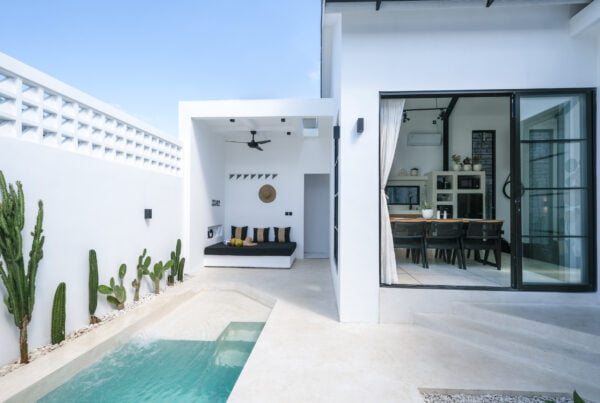 The Yucca villa design has been transformed into a gorgeous residence through the blend of minimalism and Mediterranean style. Neutral earth tones, minimalistic design, natural details, and tropical plants create an amazing holiday ambiance.