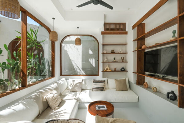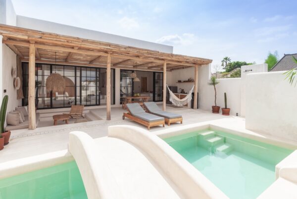 Just around the corner of Canggu's most famous street: Batu Bolong! This three-bedroom villa with a private pool and jacuzzi is like no other in Bali. Raw and minimalistic, but elegant and luxurious. The design, finishing, and furniture have been put together with attention to detail.Its spacious garden with rice fields and sunset views will guarantee a unique experience. The tropical plants and palm trees give an exotic holiday vibe.